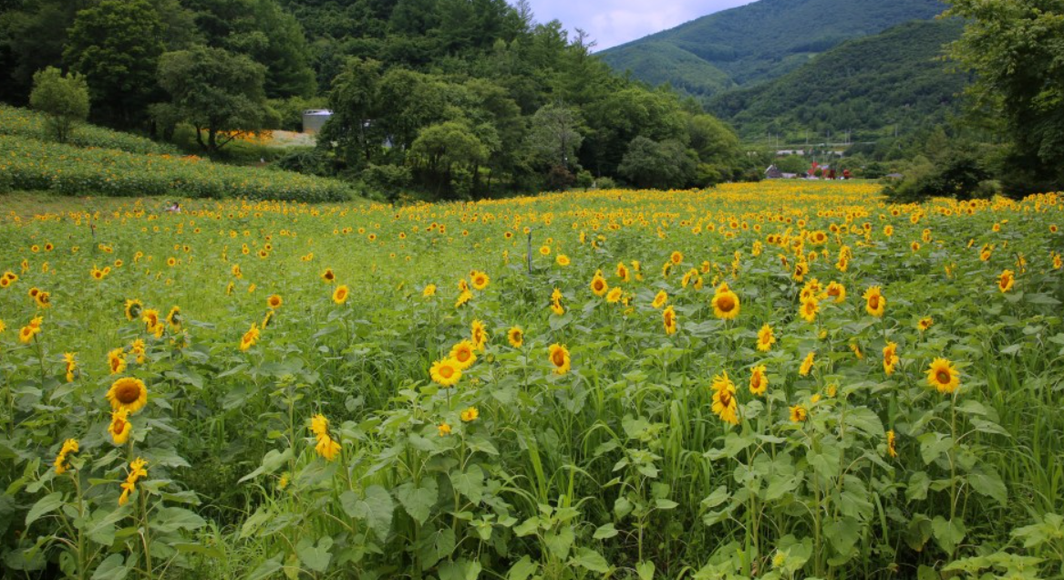 매년 해바라기 축제를 하는 곳입니다. 7월 중순부터 8월 초소까지가 해바라기 절정기입니다. 해바라기가 빼곡히 들어선 들판이 아름답습니다. 그리고 경관도 너무도 아름다운 구와우마을입니다.