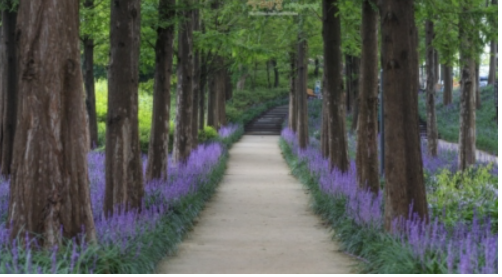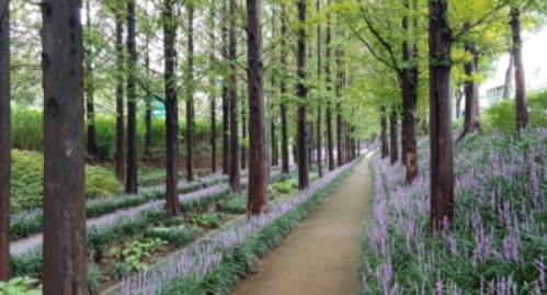 삭막한 공간에 메타세쿼이아 나무를 심고 가꾸고 그 밑에 약초로도 쓰이는 맥문동 이를 심어서 맥문동이의 꽃 색깔인 보랏빛이 잘 조화를 이루는 길입니다.