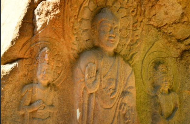 "백제의 미소"로 알려져 있는 마애석불입니다. 가운데 불상이 석가모니본존상이고 오른쪽은 구슬을 든 미륵보살 입상,