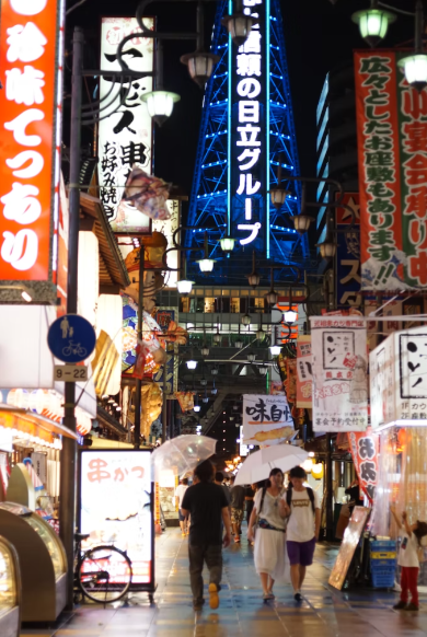 오사카의 대표적인 관광지로 중 하나로 오사카에서 가장 유명한 먹거리 거리이며, 도톤보리 강을 따라 높은 건물들과