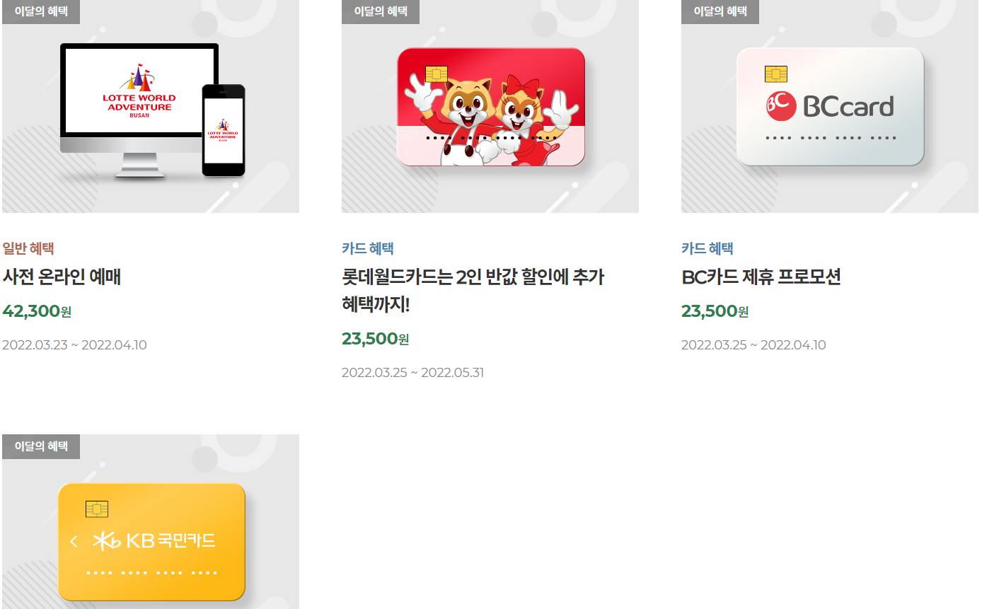 카드 혜택도 있으니 잘 챙겨서 가시고 매달 바뀔 수 있으니 롯데월드 부산 홈페이에서 검색 후 준비하세요.