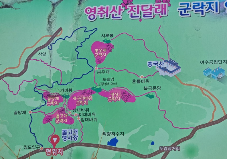 남녘에서 진달래 소식을 빨리 전해주는 산이 여수의 영취산 진달래 군락지입니다. 매년 진달래 축제를 하며  4월 초순 ~4월 중순까지 여수를 방문하면 그리 높지 않은 곳에서 진달래 수만 그루의 군락지를 만나 볼 수 있습니다.