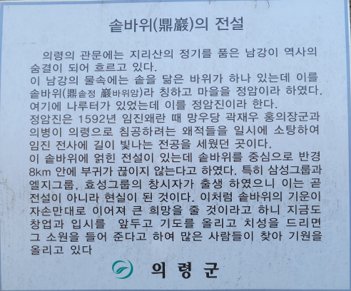 의령 가볼만한 곳 베스트10의 제일이 전설의 솥바위, 한문으로 정암 바위입니다. 우리나라 3대 그룹의 창업자들 위치해 있었어 전설이 아니라 현실이 되었습니다.