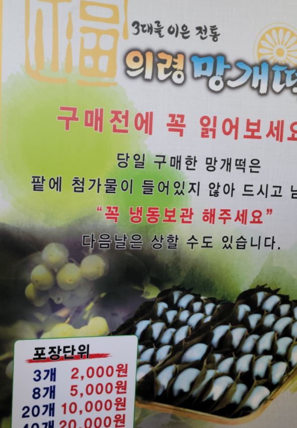 의령의 먹거리 중 망개떡이 유명합니다. 예로부터 망개나무가 많아서 망개잎으로 상하지 않게 떡을 싸서 만든 것입니다. 의령 전통시장에 가면 많이 있는데 소바집에서 가까이 있어서 소바를 드시고 망개떡을 포장하여 먹을 수 있습니다.