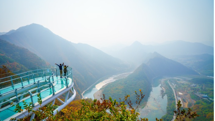 언론에 자주 등장하는 강원도 동강의 한반도 지도 모양의 땅입니다. 정선군 정선읍 병방치길 225 네비를 치고 가시면 주차장에 주차 후 전망대를 가면 동강 한반도 지도 모양의 지형을 스릴 넘치는 강화 유리판 위에서 볼 수 있습니다.