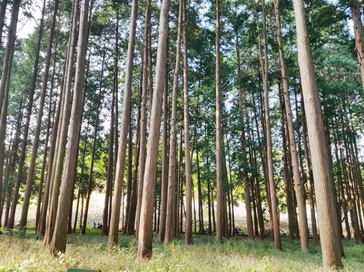 이제 동부 양산으로 넘어가는 길목에 있는 법기수원지를 소개합니다. 법기수원지는 상수원 보호를 위해 인반인들의 출입을 철저히 통제했기 때문에 수려한 자연과 산림욕까지 즐기수 있는 명소입니다. 1932년에 완공된 수원지로 침엽수림인 측백나무와 편백을 비롯해 높이 30~40m에 달하는 개잎갈나무등이 이루고 둑 위에 있는 수십 년 반송나무가 절경을 이루고 있습니다.