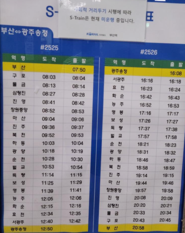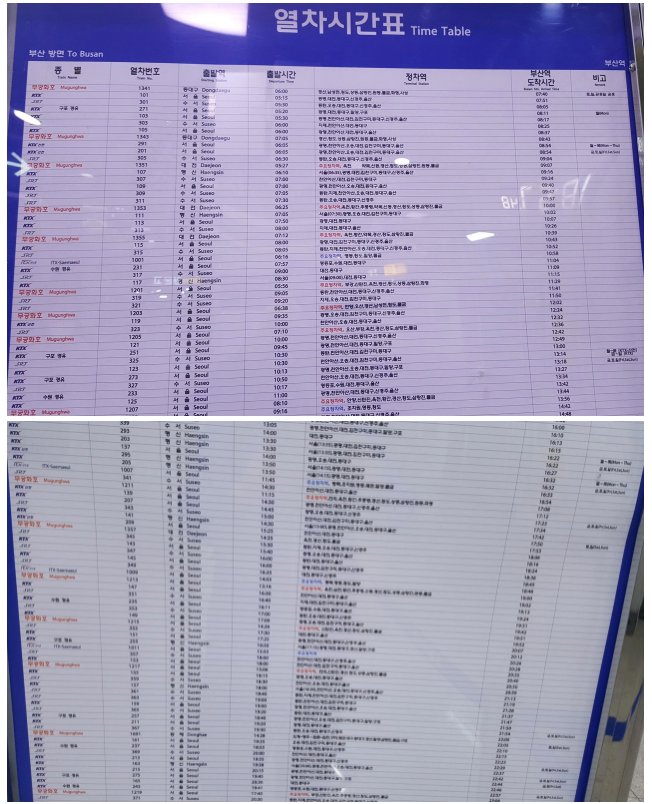 부산역에서 출발하여 마산- 진주-순천-광주 송정역까지 가는 기차시간표입니다.