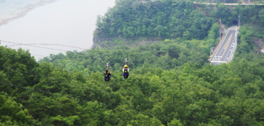 만천하 스카이워크는 남한강 절벽 위에서 8090m 수면 아래를 내려보면 하늘 길을 걷는 스릴을 맛볼 수 있는 스카이워크로 시내 전경과 멀리 소백산 연화봉을 볼 수 있고 만천 화 집와이어는 길이 980m 2개의 고정된 와이어로프를 타고 무동력으로 활강하듯이 내렸갑니다.