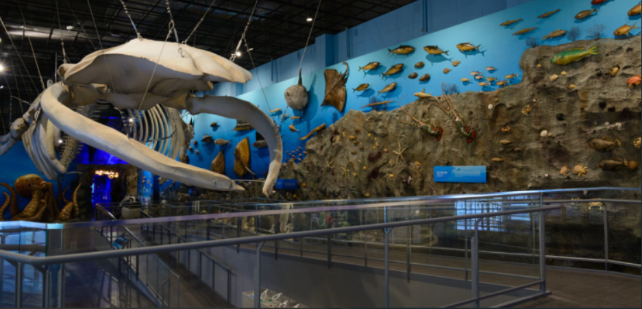 골격, 화석 등(대왕고래뼈, 고래상어, 백상아리, 산호, 불가사리, 고동, 조개, 투게 등)이 전시되어 있습니다.