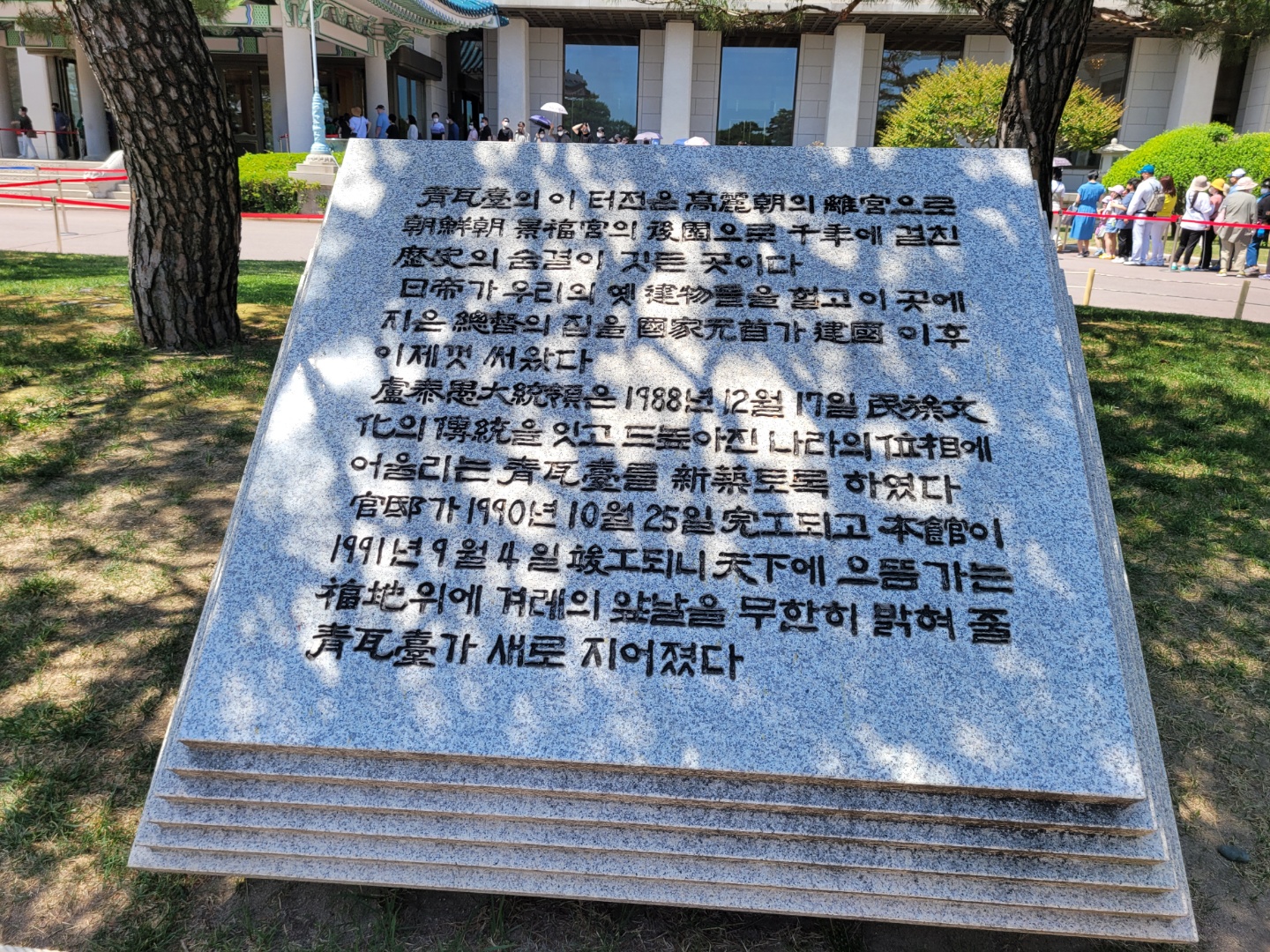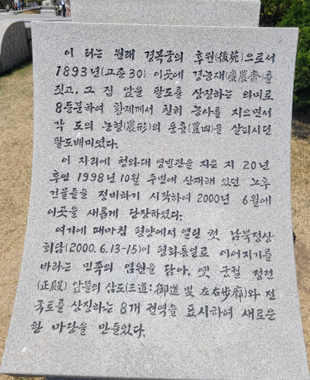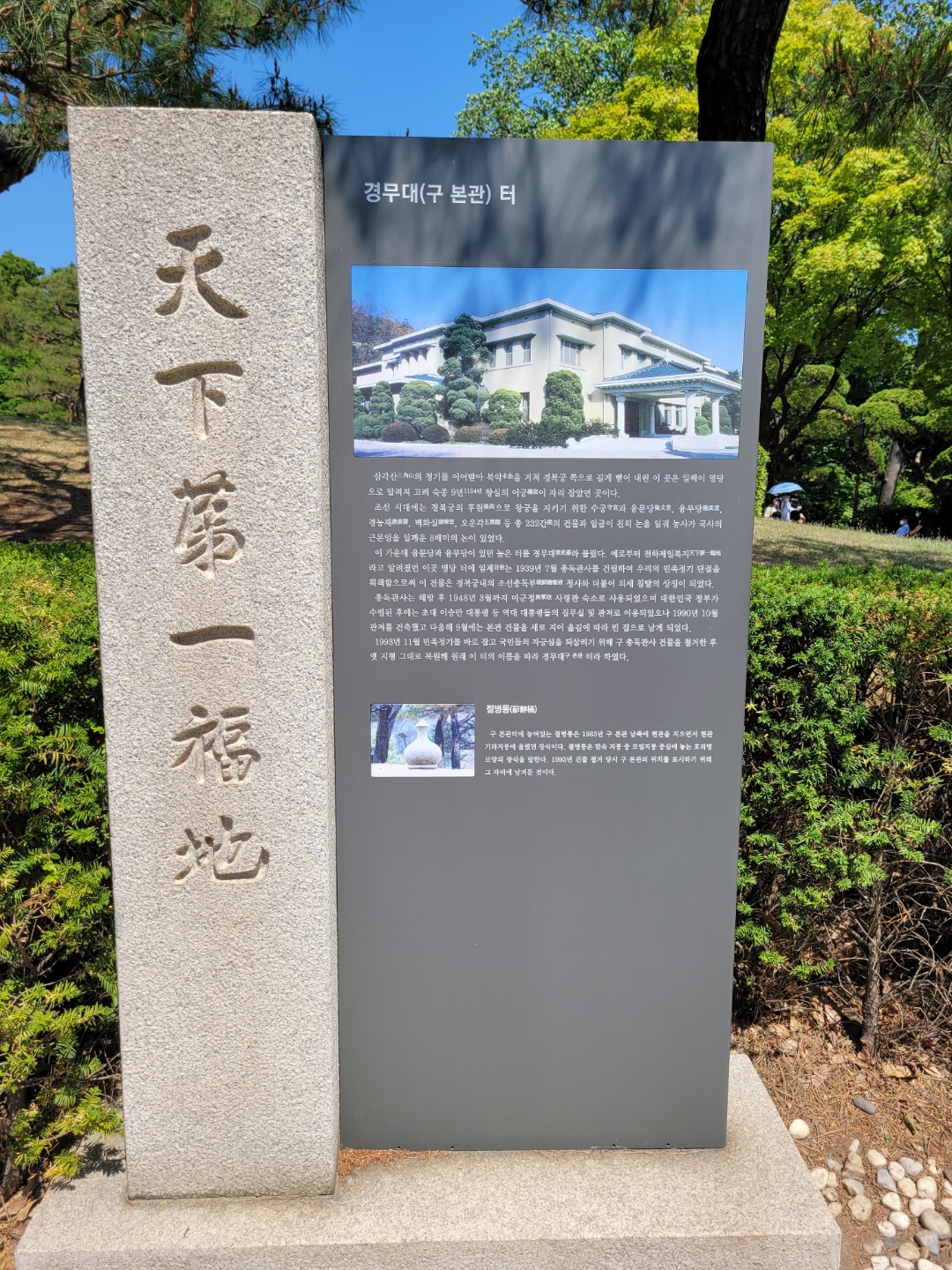 청와대 본관에서 오른쪽으로 문을 하나 통과후 오르는 곳입니다. '천하제일복지'라는 돌비석이 나옵니다. 청와대 본관 공사 때 발굴된 돌 비석입니다. 관저로 오르는 언덕에 오르는 곳에 있는 멋진 와가와 대리석 아치형 문이 여러개 있는 집이 있습니다.
