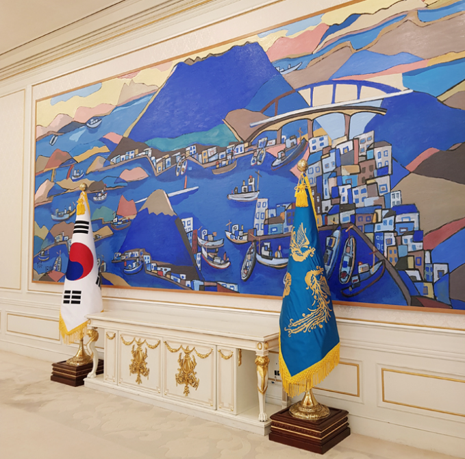 청와대 본관내부입니다. 장관 임명장을 수여하던 충무관, 충무실 가기 전 통영항입니다. 한국의 피카소 통영의 전혁림 화가의 90세 때의 작품이 걸려있습니다. 대통령 집무실이 있습니다.