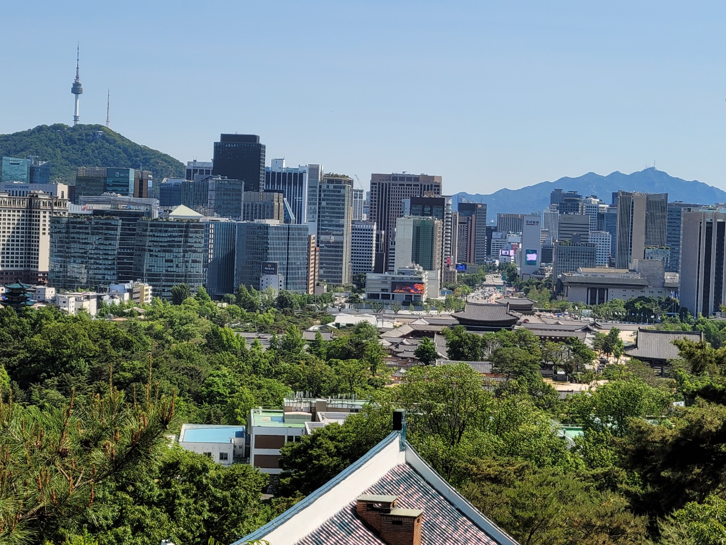미나불에서 내려다 본 남산타워와 서울 중심지입니다. 앞쪽의 기와지붕이 관저 지붕끝입니다.