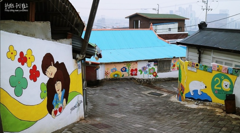 한국전쟁 당시 피란민들이 살면서 생거냔 곳으로 좁은 집들이 다닥다닥 붙어 있는 곳인데 2007년 공공미술 프로젝트 사업을 통해 골목에 그림이 생겨났습니다. 드라마 '카인과 아벨'의 촬영지로 알려지면서 관광객들이 많이 찾는곳입니다.
