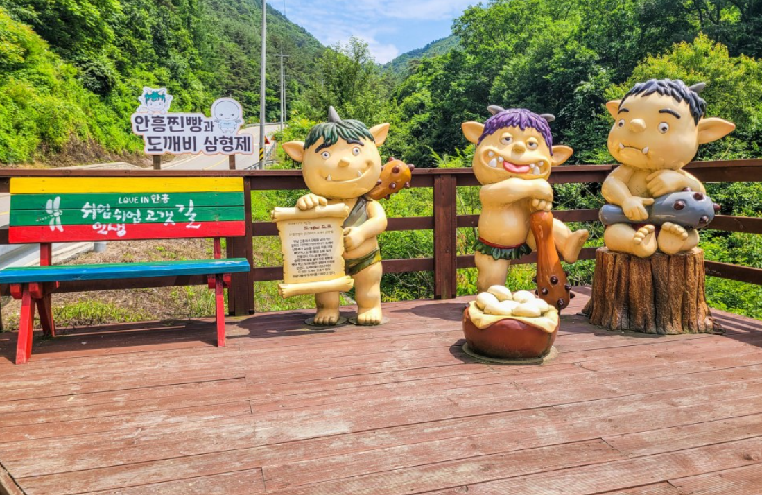 도로부변의 환경적인 영향의 착시현상으로 육안으로는 내리막길인데 실제로는 오르막길로 보이는 것과 반대로 된 길이나 도로를 말하는데 옛날 안흥에서 강림을 넘어가는 길목에 장난꾸러기 도깨비 삼형제가 지나는 사람들을 상대롤 먹을 것을 빼앗거나 도깨비불로 길을 잃게 만드는 장난을 쳤다고 합니다. 어느날 술떡안에 팥을 넣어 만든 찐빵을 뺏어 먹고 도깨비들은 삼형제 바위로 변했다고 합니다. 도깨들이 장난치던 이곳은 도깨비도로가 되었다는 전설이 내려오고 있는 곳입니다.