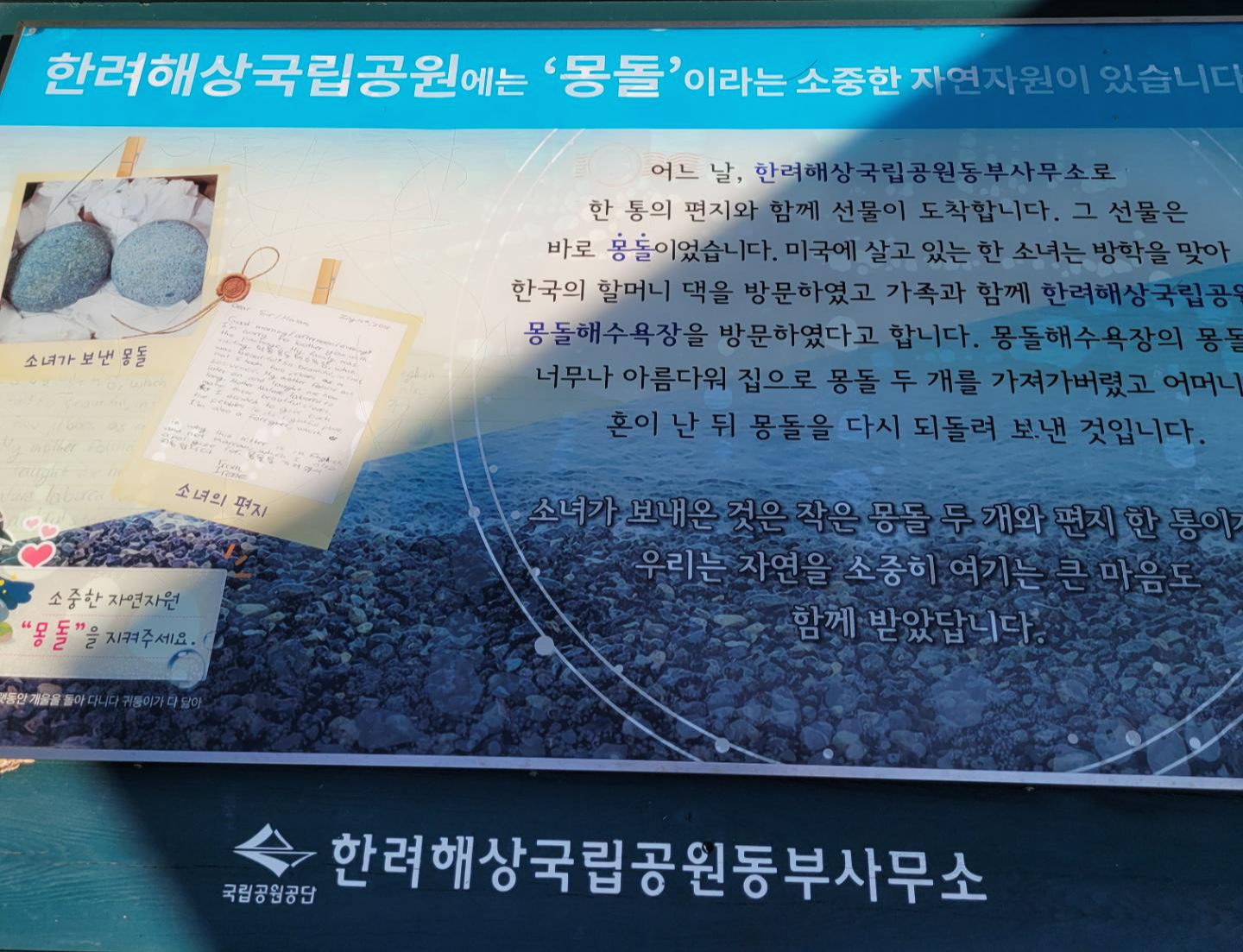 소녀가 보내온 것은 작은 몽돌 두 개와 편지 한 통이지만 우리는 자연을 소중히 여기는 큰 마음도 함께 받았답니다.