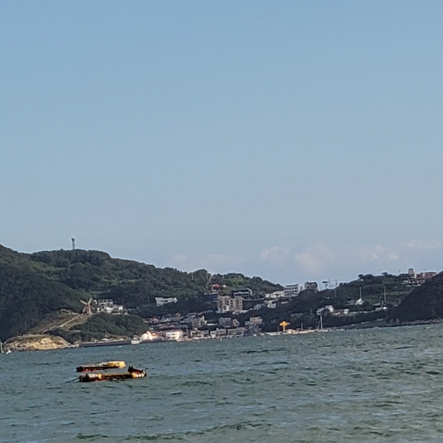 거제 학동 몽돌해수욕장에서 바라보이는 거제 바람의 언덕, 풍차 보이는 곳입니다.