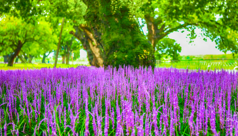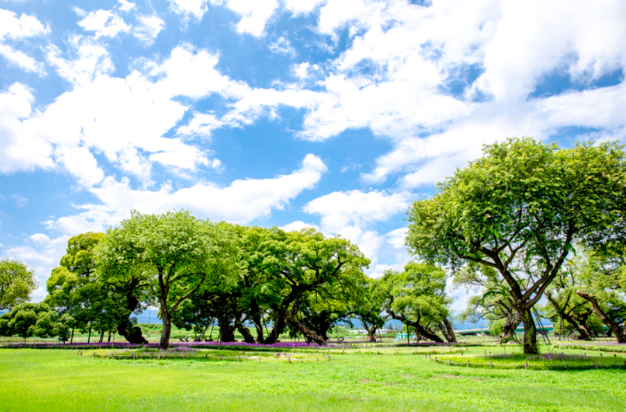 왕버들나무 59그루가 자리하고 있는 힐링코스입니다. 맥문동 이를 심어서 맥문동이 꽃으로 한결 아름답습니다.