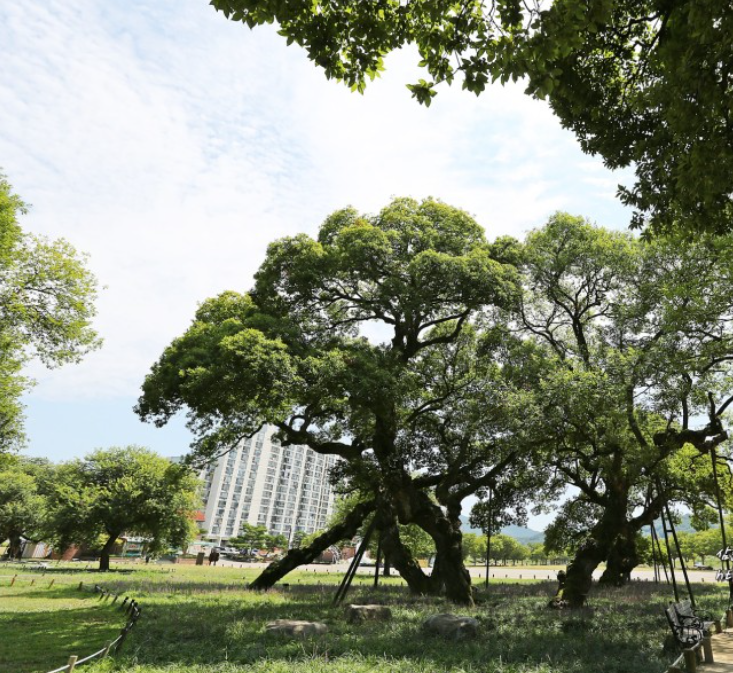 풍수지리설에 따라서 만들어진 습입니다. 조선 중기 마을의 소년들이 이유 없이 죽자 풍수지리설에 따라 숲을 조성하면 재왕을 막을 수 있다고 하여 밤나무숲을 조성했습니다. 그 후에 왕버들나무로 다시 조성하여 지금은 300~500년 수령의